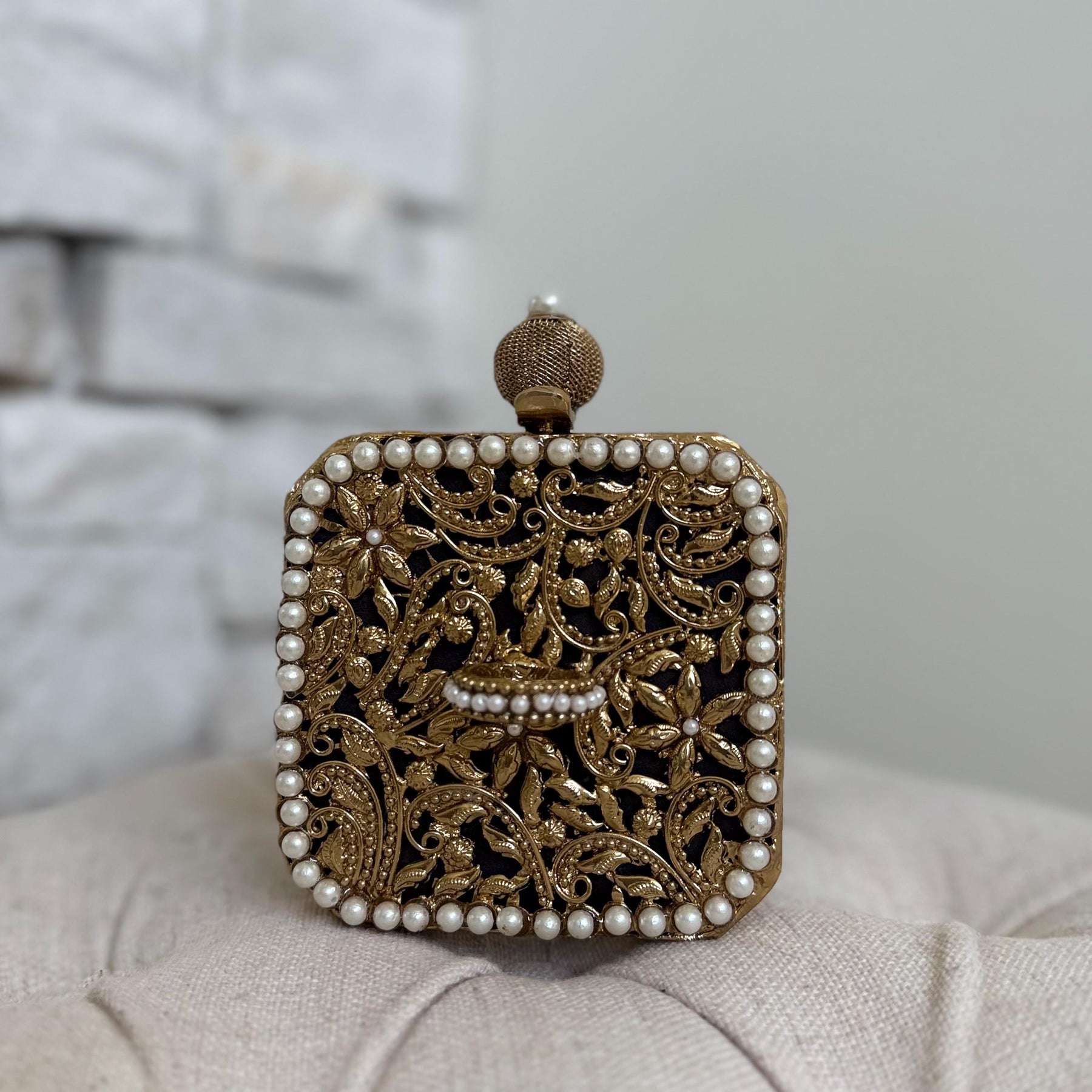 Introducing our exquisite Mini Mother of Pearl Clutch, a perfect blend of elegance and sophistication. This stunning accessory features a gold-plated brass frame that adds a touch of luxury, complemented by a plush suede lining for a refined interior finish. The clutch showcases a beautiful handmade floral pattern with delicate pearl details, making it a true statement piece. Designed with practicality in mind, it comes with a chic ring-shaped handle and a thick chain, offering versatile carrying options. Elevate your evening ensemble with this timeless and elegant clutch.