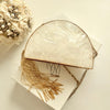 Elevate your bridal look with our exquisite moon-shaped clutch, a true masterpiece of craftsmanship and luxury. Inspired by the celestial beauty of the moon, this clutch is meticulously handcrafted from pure brass and adorned with luminous mother of pearl, creating a mesmerizing iridescent glow.