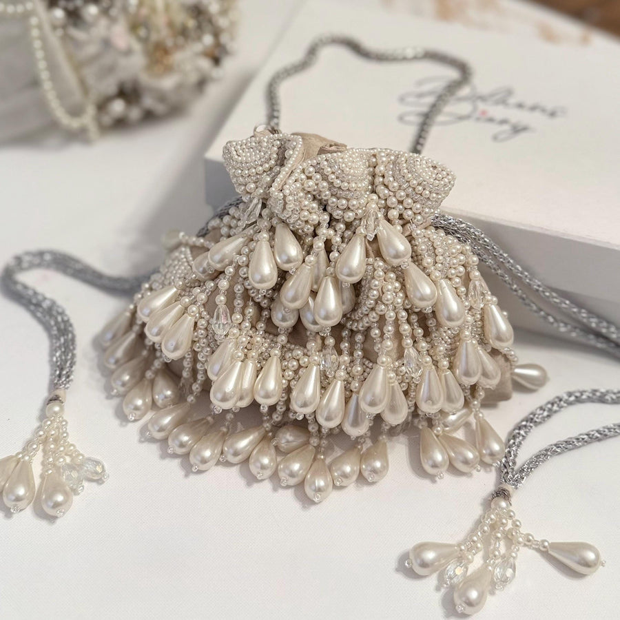 Pearl Beaded Bridal Potli Bag | Handmade Raw Silk Handbag