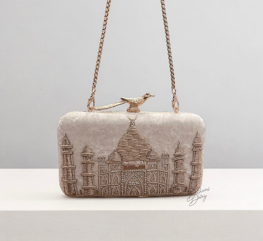 Taj Mahal Inspired Bridal Keepsake Box: Gold Zardozi Embroidered Velvet Jewelry Storage
