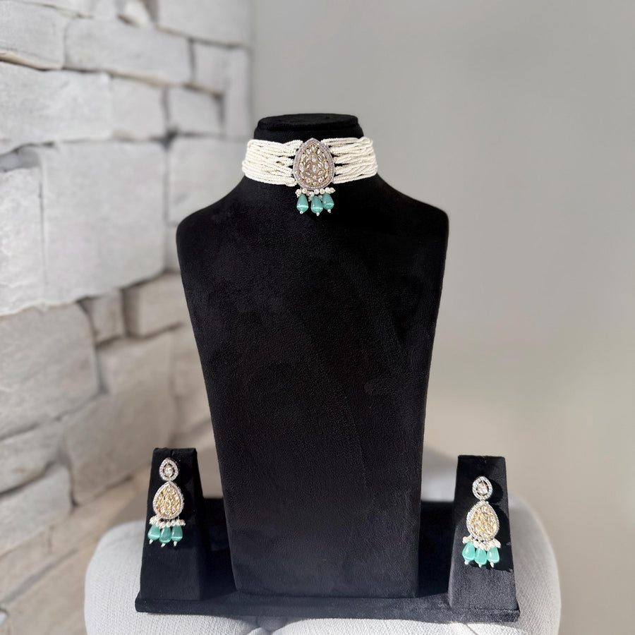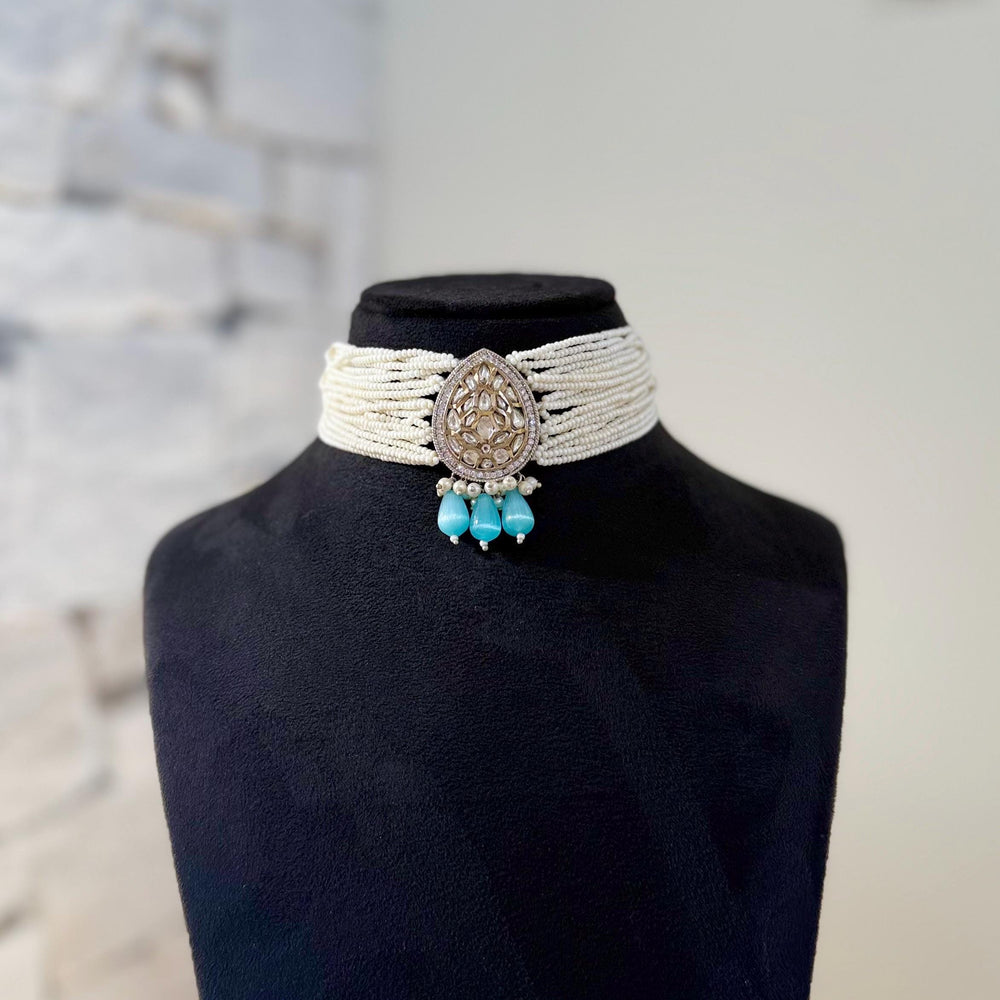 Victorian Kundan Choker Set: Aqua, Silver & Gold Indian Jewelry
