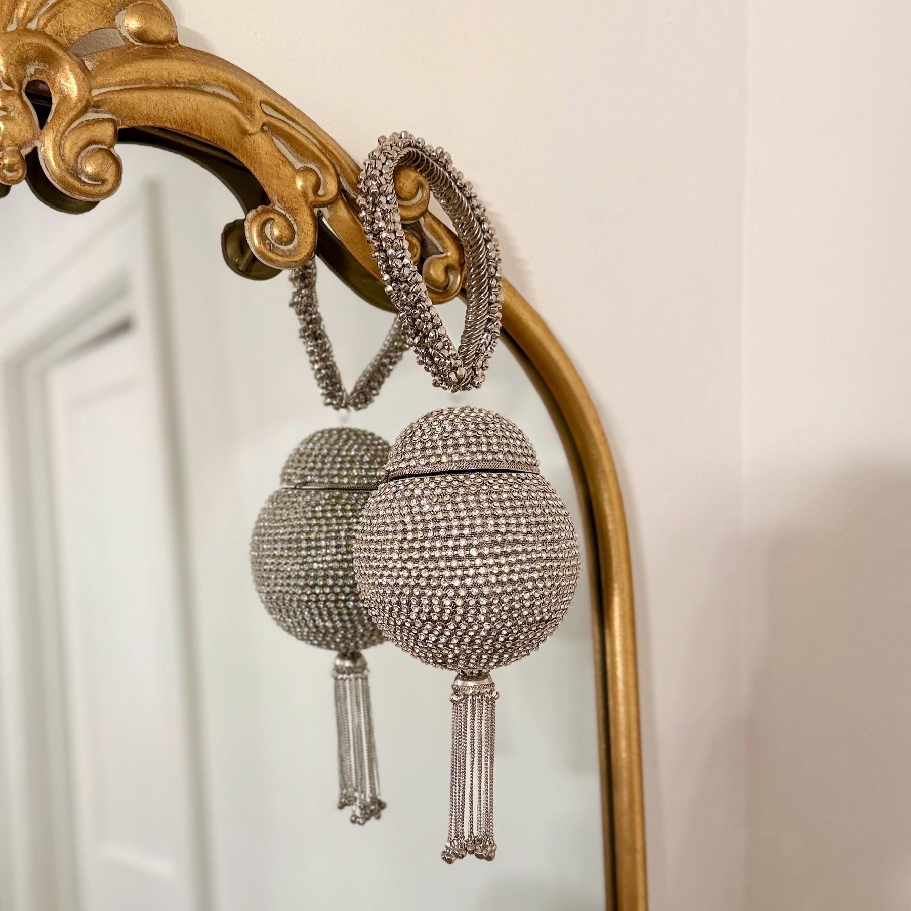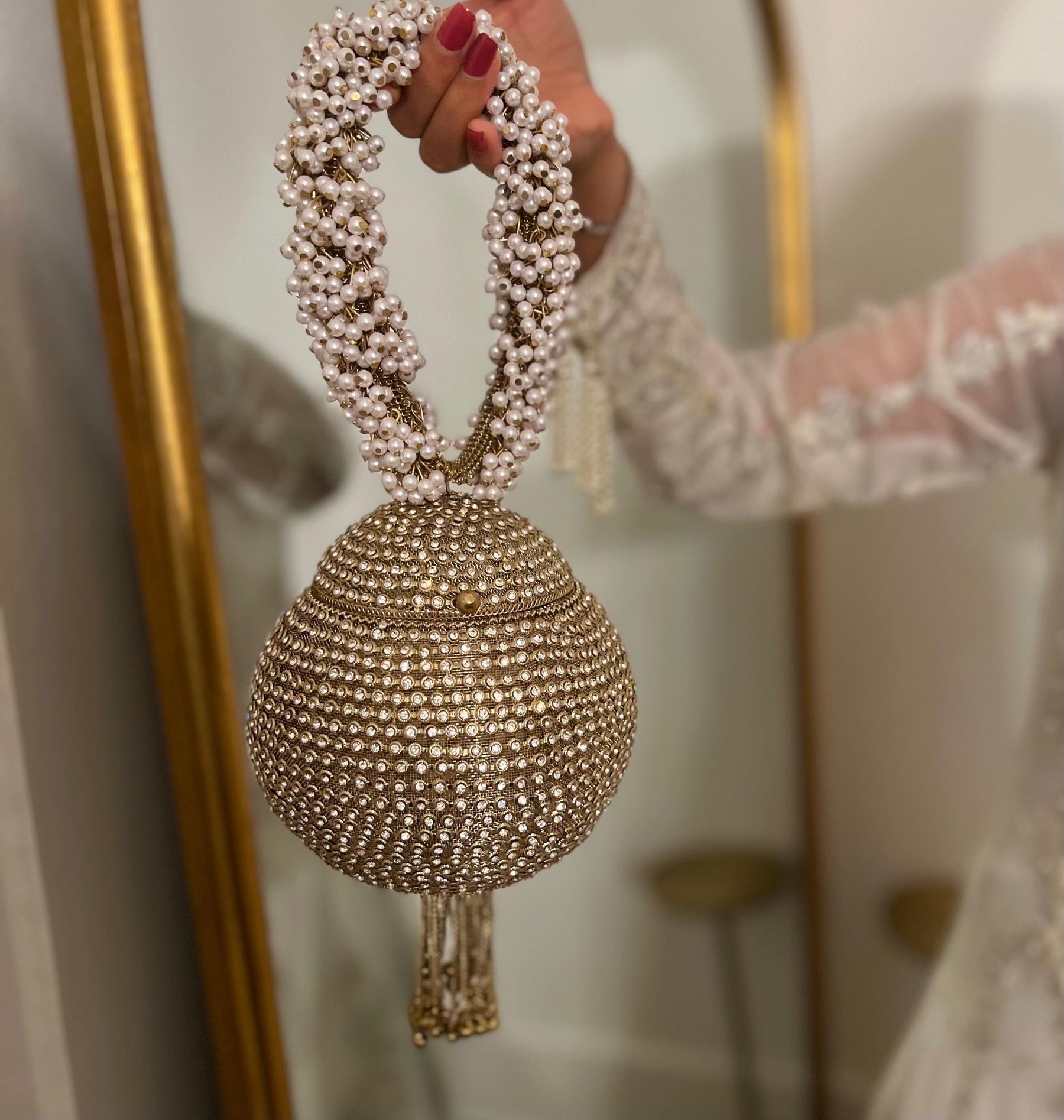 Introducing our show-stopping round bridal handbag, designed to turn heads on your special day. Adorned with hand-placed iridescent crystals, this exquisite piece captures the light beautifully, creating a dazzling effect with every movement. The elegant beaded bracelet handle allows you to keep your hands free, making it effortless to spin into cocktail hour or dance the night away. Elevate your bridal look with this luxurious accessory that combines glamour and functionality in one stunning package. Perfect for the modern bride who seeks to make a memorable statement.