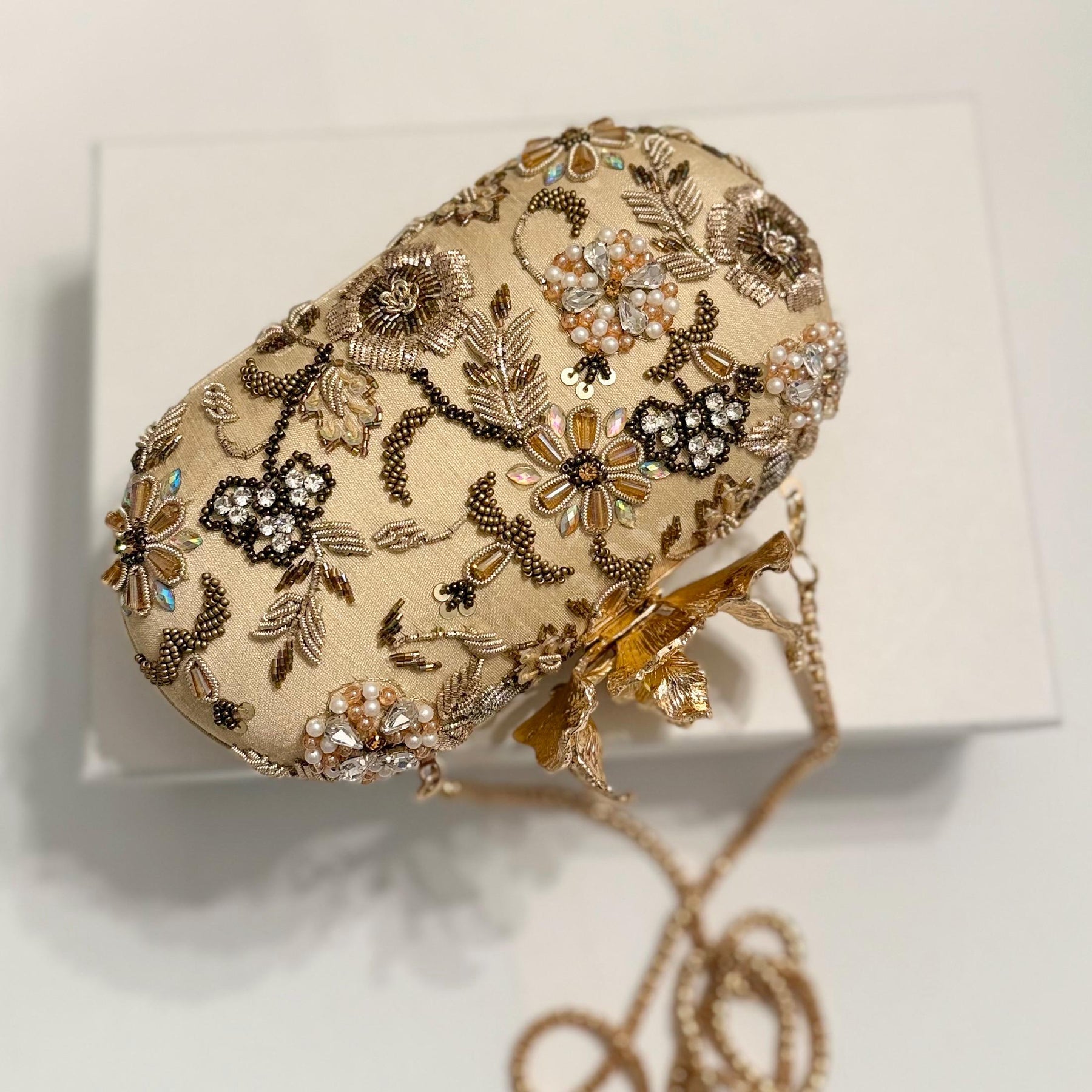 Elevate your bridal look with our luxurious Gold Bridal Statement Clutch, a masterpiece of elegance and craftsmanship. This stunning piece features intricate gold, silver, and bronze embroidery, beautifully woven together to create a shimmering, regal effect.