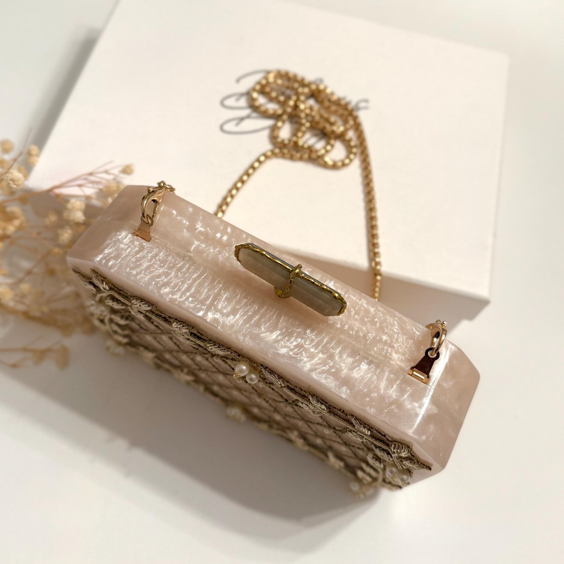 Introducing our exquisite hand-embroidered bridal clutch, a masterpiece that seamlessly blends traditional craftsmanship with contemporary elegance. Meticulously crafted from high-quality resin, this clutch features intricate hand embroidery adorned with detailed cutwork on the front, showcasing exceptional artistry.