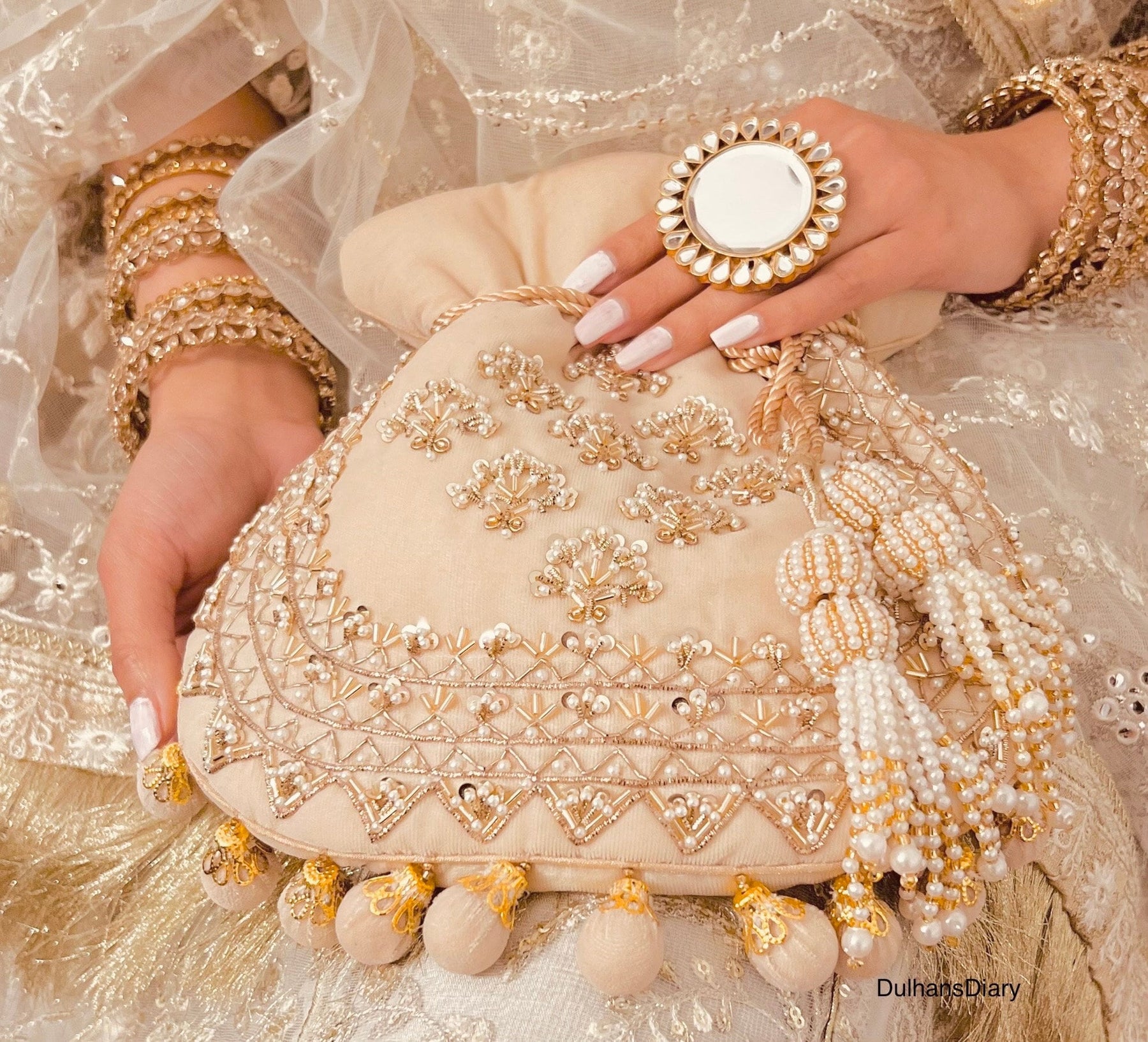 #Ivorypotlibag #handmadeclutch #bridalhandbag #weddingaccessories #ethnicbag #uniquegift #artisanmadeclutch #punjabiclutches #potlibag #ivorycreampotlibag