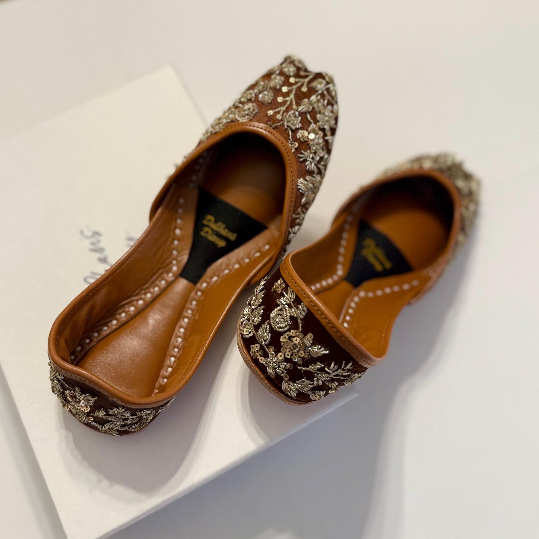 Introducing our exquisite Brown Bridal Khussa, a true masterpiece crafted to enhance your special day with elegance and comfort. Meticulously handcrafted with genuine leather and adorned with high-quality satin, these Khussa shoes are the epitome of luxury and style.