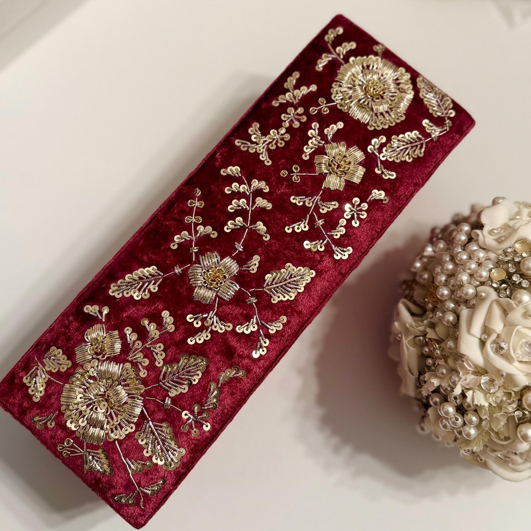 Introducing our exquisite Handmade Bangle Box, a luxurious treasure crafted with meticulous attention to detail. This opulent box features stunning gold zardozi work intricately embroidered on rich maroon velvet fabric, creating a regal and timeless aesthetic. Perfectly designed to hold and display your precious bangles, this box is an ideal bridal gift, blending elegance and tradition. With its beautiful craftsmanship, it ensures that your cherished bangles are stored safely while adding a touch of grandeur to any bridal trousseau. Elevate your gifting experience with this magnificent piece, a true symbol of love and celebration.