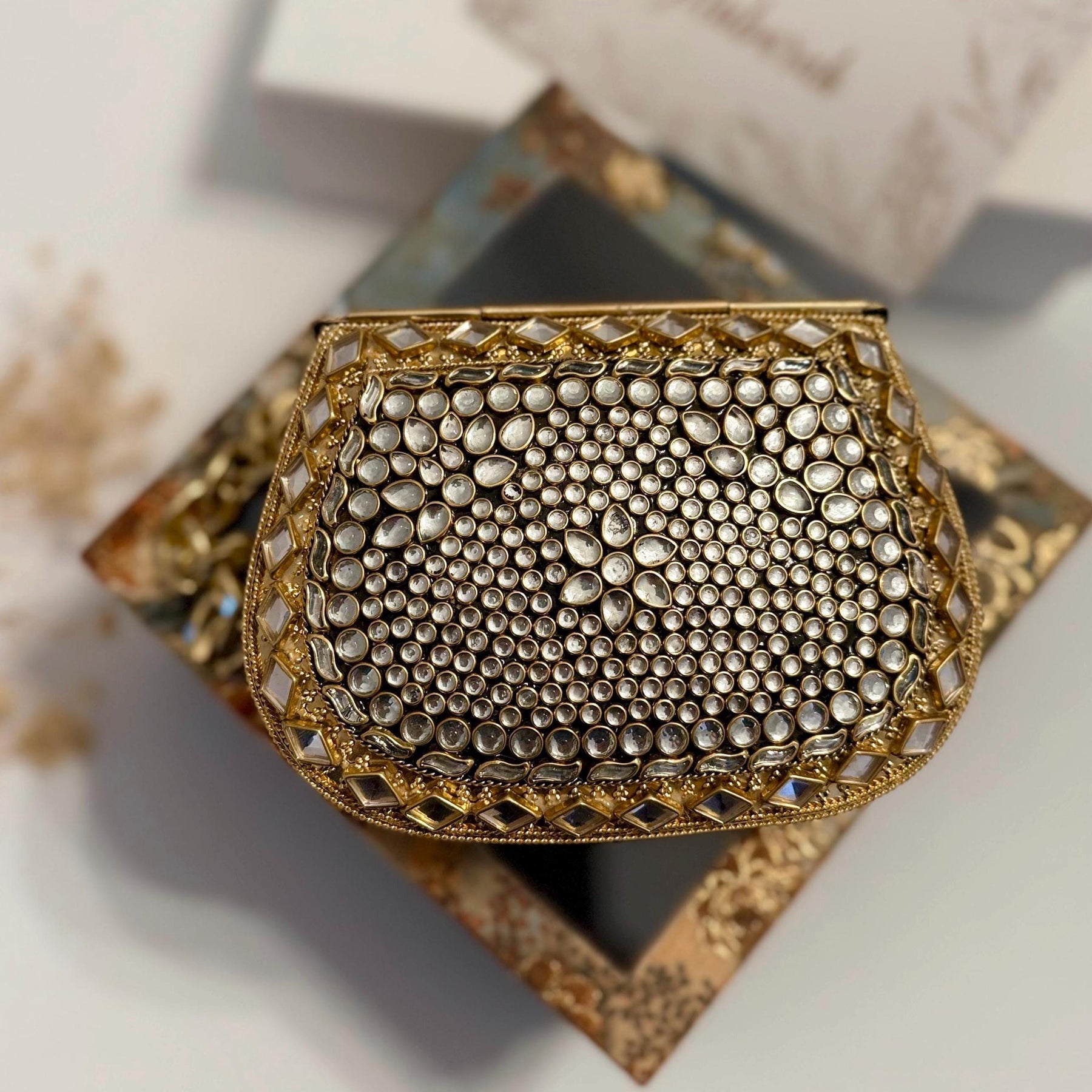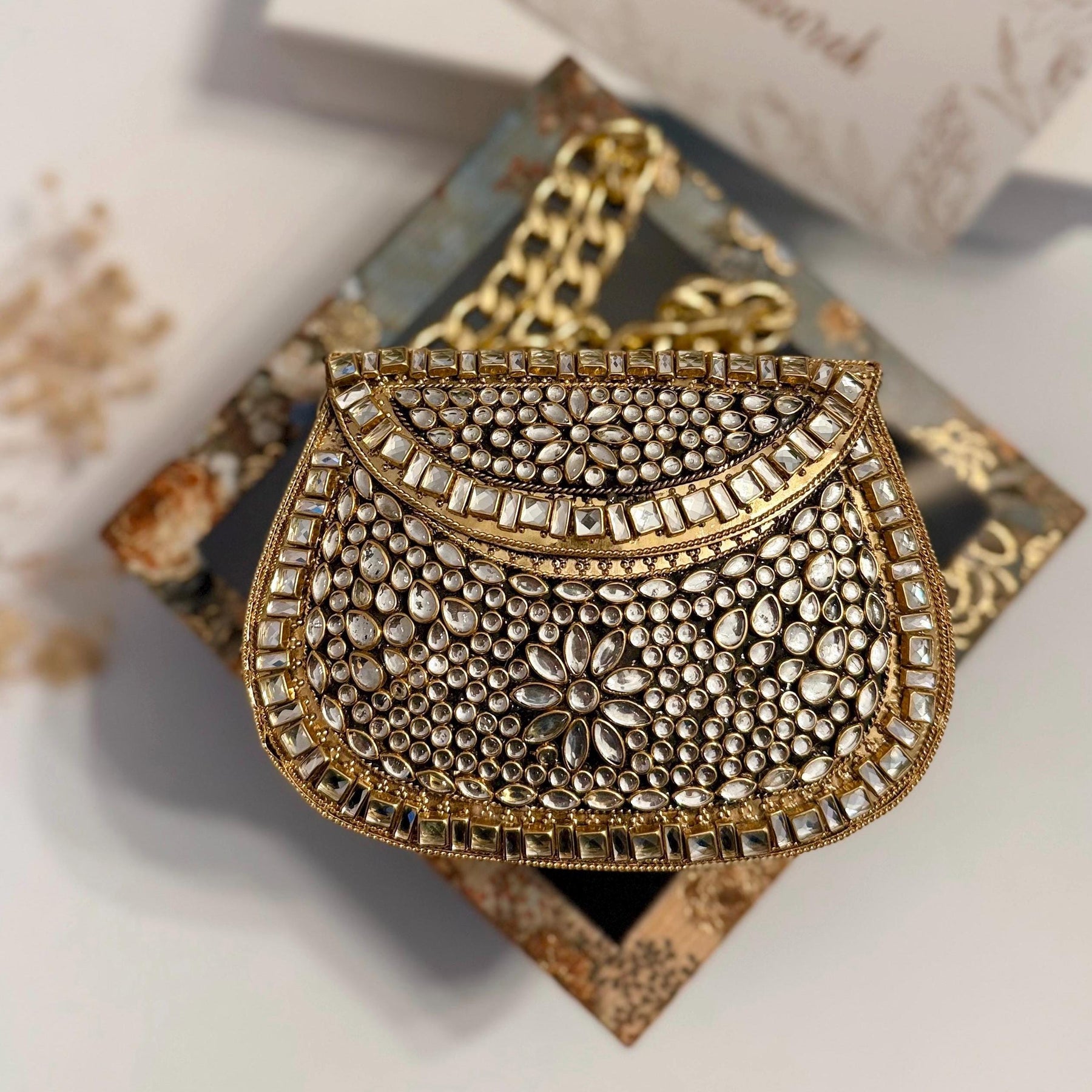 Our Mini Kundan Clutch is Crafted with premium metal and adorned with hand-placed Kundan stones, this clutch is a true masterpiece of elegance and craftsmanship.