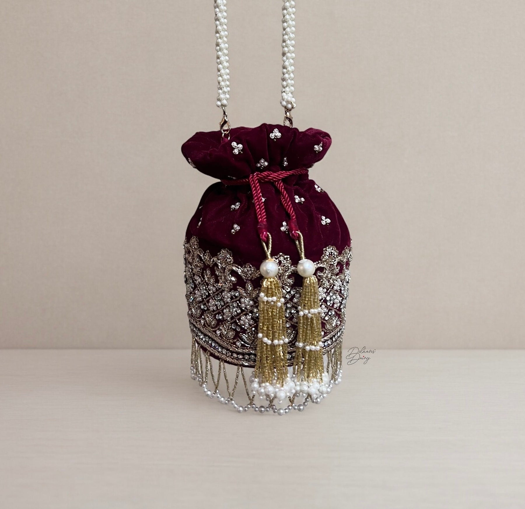 Indulge in timeless elegance with our exquisite bridal potli bag, meticulously crafted in deep red velvet to capture the essence of luxury and tradition. Designed with South Indian brides in mind, this opulent accessory is adorned with intricate dabka, beadwork, sparkling stones, and shimmering sequins, ensuring a mesmerizing entrance on your special day. Elevate your bridal ensemble with this stunning potli bag, a symbol of sophistication and grace.