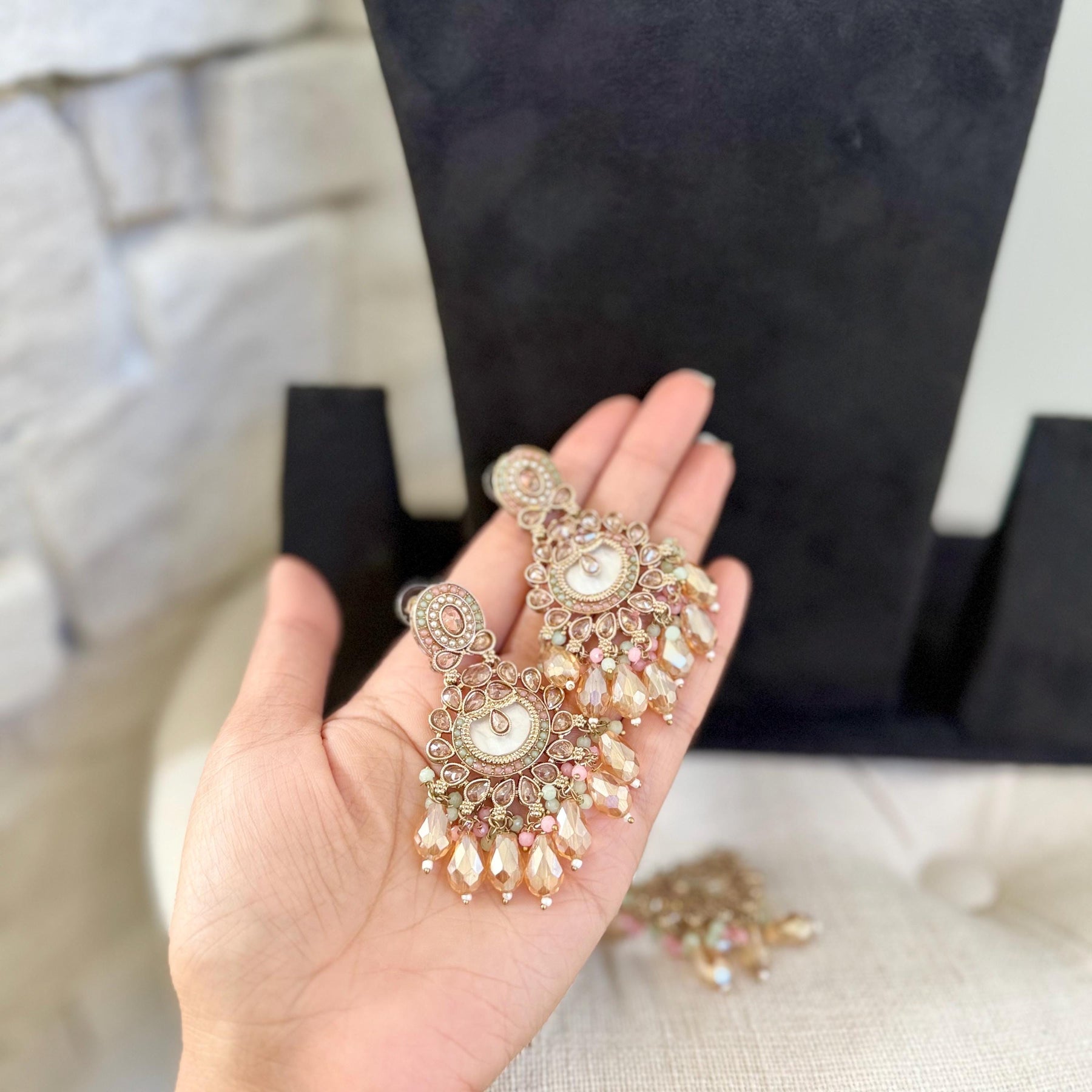 • Necklace: A statement centerpiece adorned with delicate mother of pearl and soft pink and mint accents, exuding sophistication.