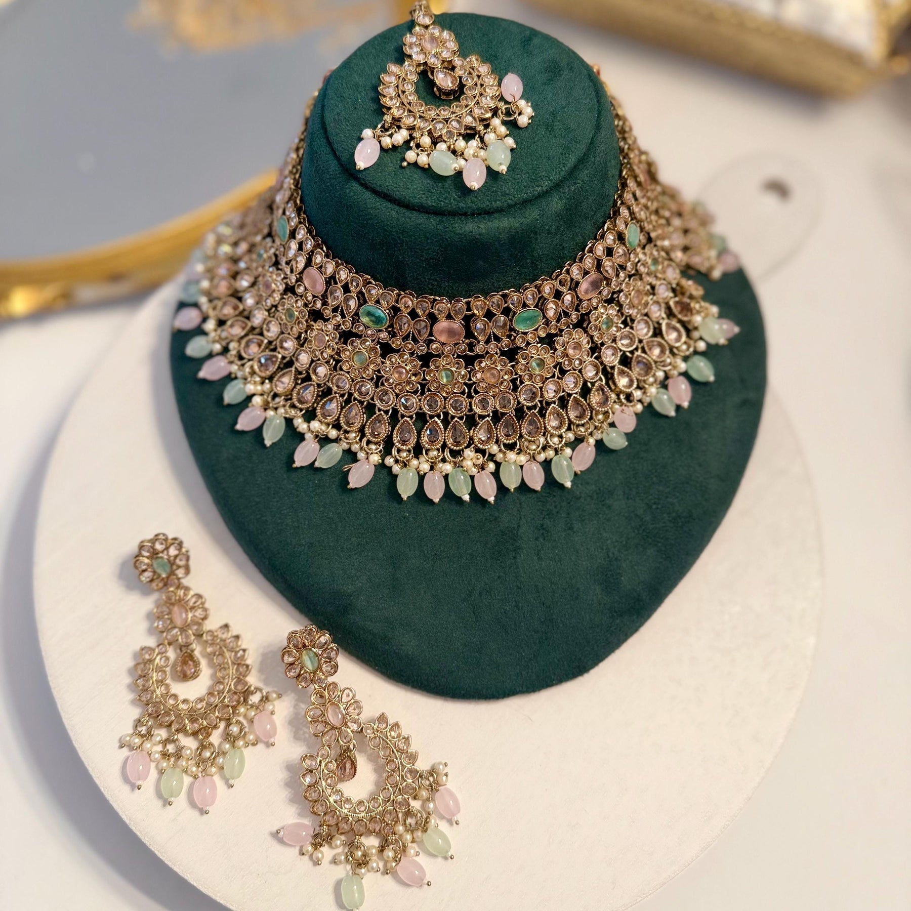 Multicolor Polki Necklace Set | Sage Green/ Pink Polki Jewelry Set