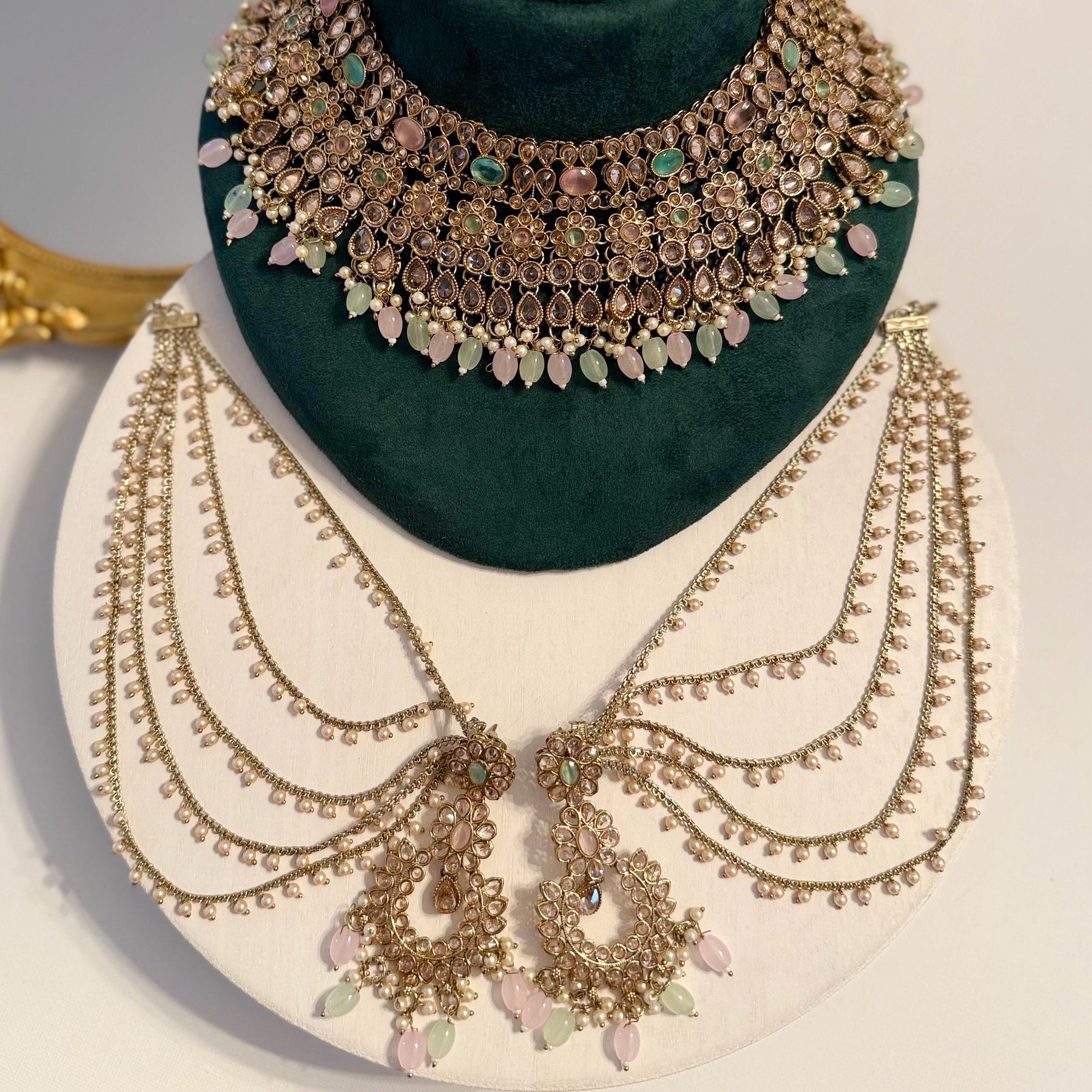 Introducing our exquisite Indian Multicolor Bridal Necklace Set, a perfect blend of tradition and elegance. This set features a stunning necklace adorned with gold finish and delicate polki work, complemented by matching earrings and a headpiece.
