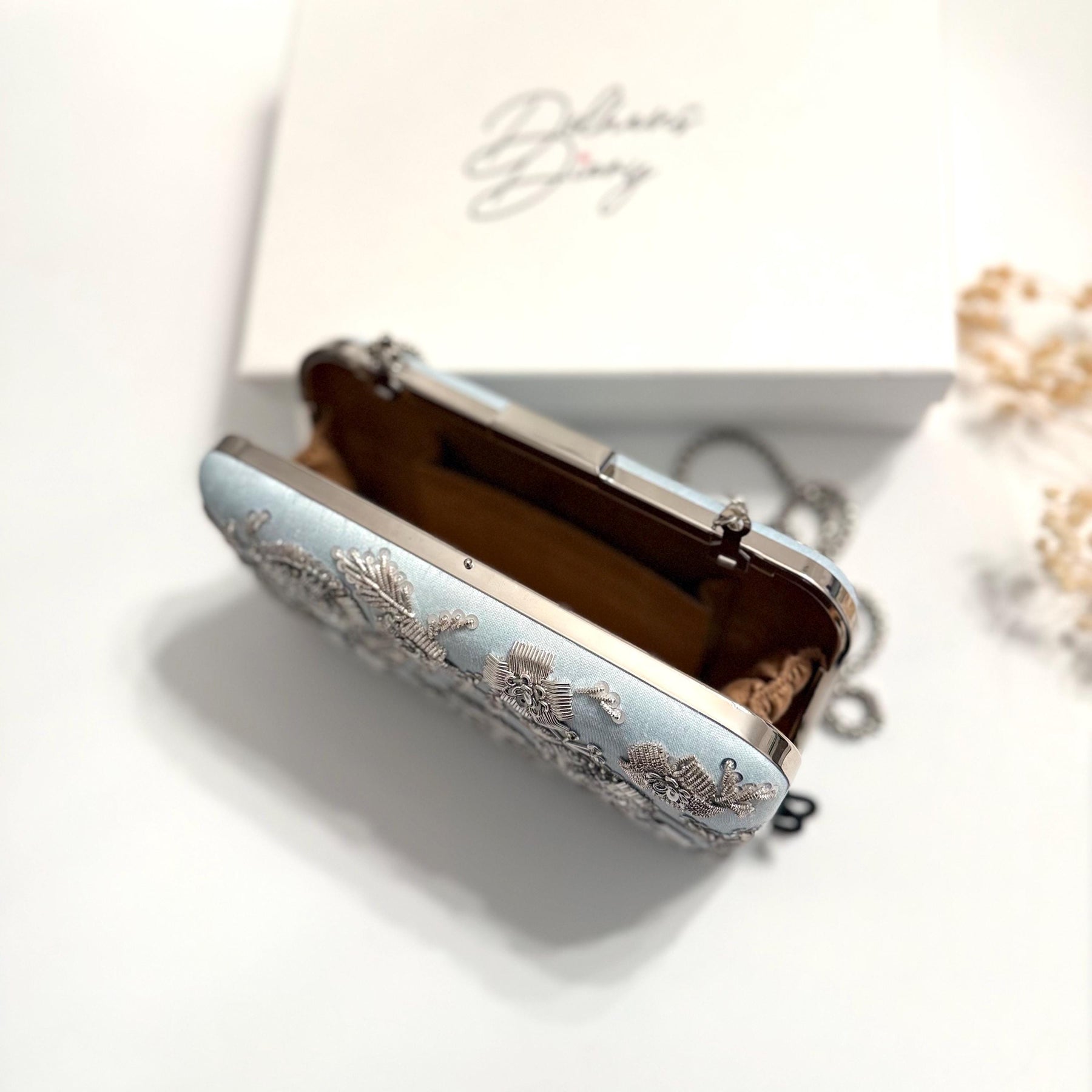 Powder Blue Zardozi Clutch: Handmade Raw Silk Bridal Purse