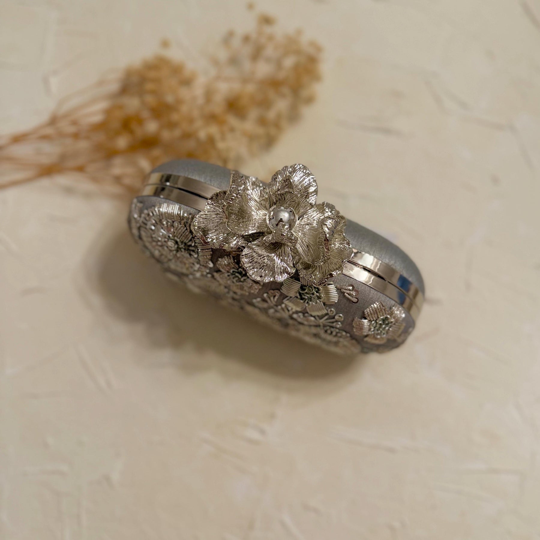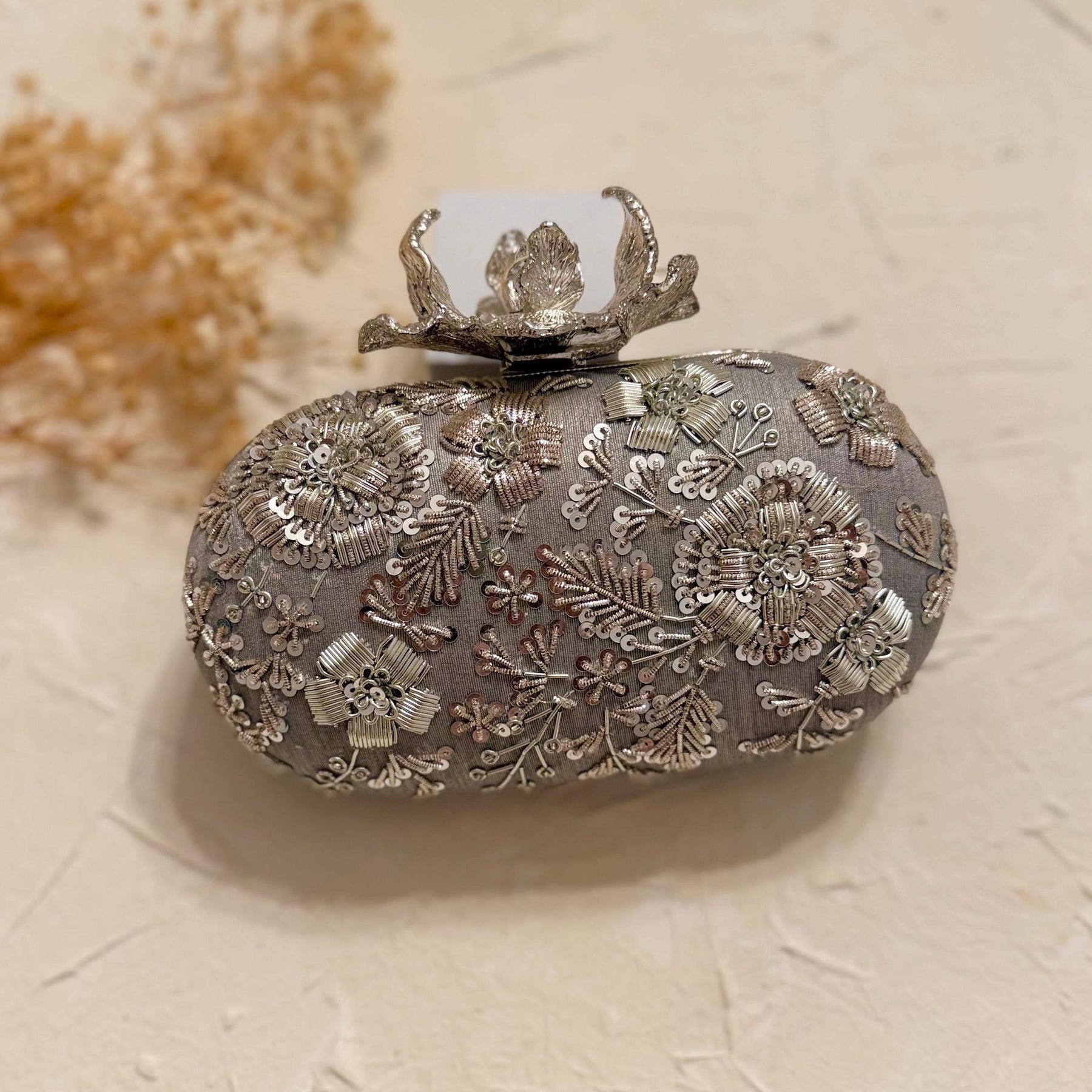 Complete your bridal look with our stunning silver oval-shaped clutch, designed to add a touch of luxury and elegance. Crafted from premium raw silk, this clutch showcases intricate Zardosi handwork on one side, radiating timeless beauty.